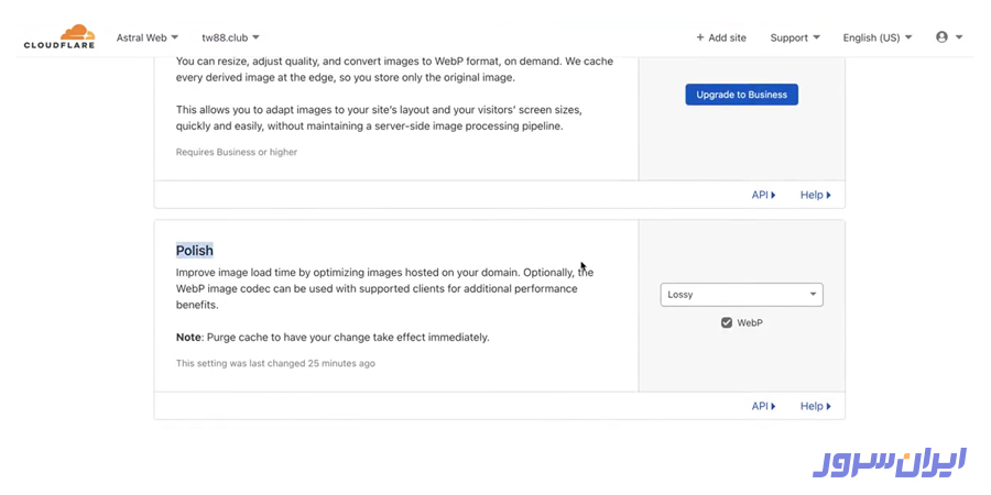 ۷. کمی به پایین اسکرول کنید تا به گزینه Polish برسید. کادر WebP باید تیک داشته و فعال باشد. همچنین در لیست کشویی، تنظیمات را روی همان Lossy نگه دارید. فشرده‌سازی Lossy حجم تصاویر را کم و سرعت سایت‌تان را بالا می‌برد؛ اما دقت داشته باشید که کیفیت آن‌ها را کمی پایین می‌آورد. این کاهش کیفیت چندان قابل تشخیص و محسوس نیست. پس نگران عدم وضوح یا شطرنجی شدن تصاویر سایت‌تان نباشید.