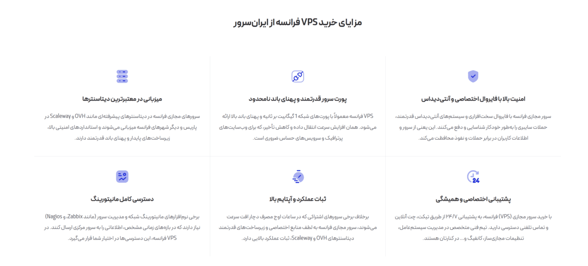 با خرید سرور مجازی فرانسه، به سرویسی امن و پرسرعت دسترسی خواهید داشت که در بهترین دیتاسنترهای مستقر در دیتاسنترهای معتبر فرانسه، مانند OVH، با منابع اختصاصی و سرعت بالا میزبانی میشود