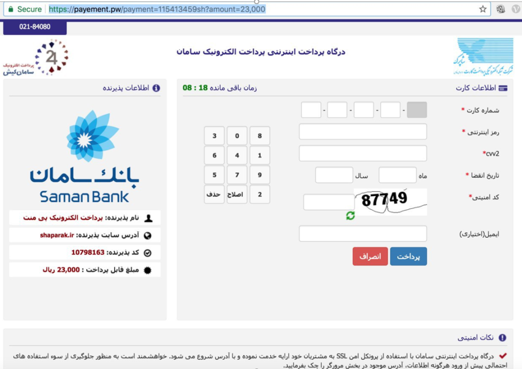 در واقع دارین وارد دام ماهیگیری میشید. اونجا حتما یه لینکی یه دکمه ای چیزی با عنوان «جهت انتقال به درگاه بانک … و پرداخت …» یا عبارتی مشابه وجود داره که مثلا شما رو به یه همچین آدرسی میبره: